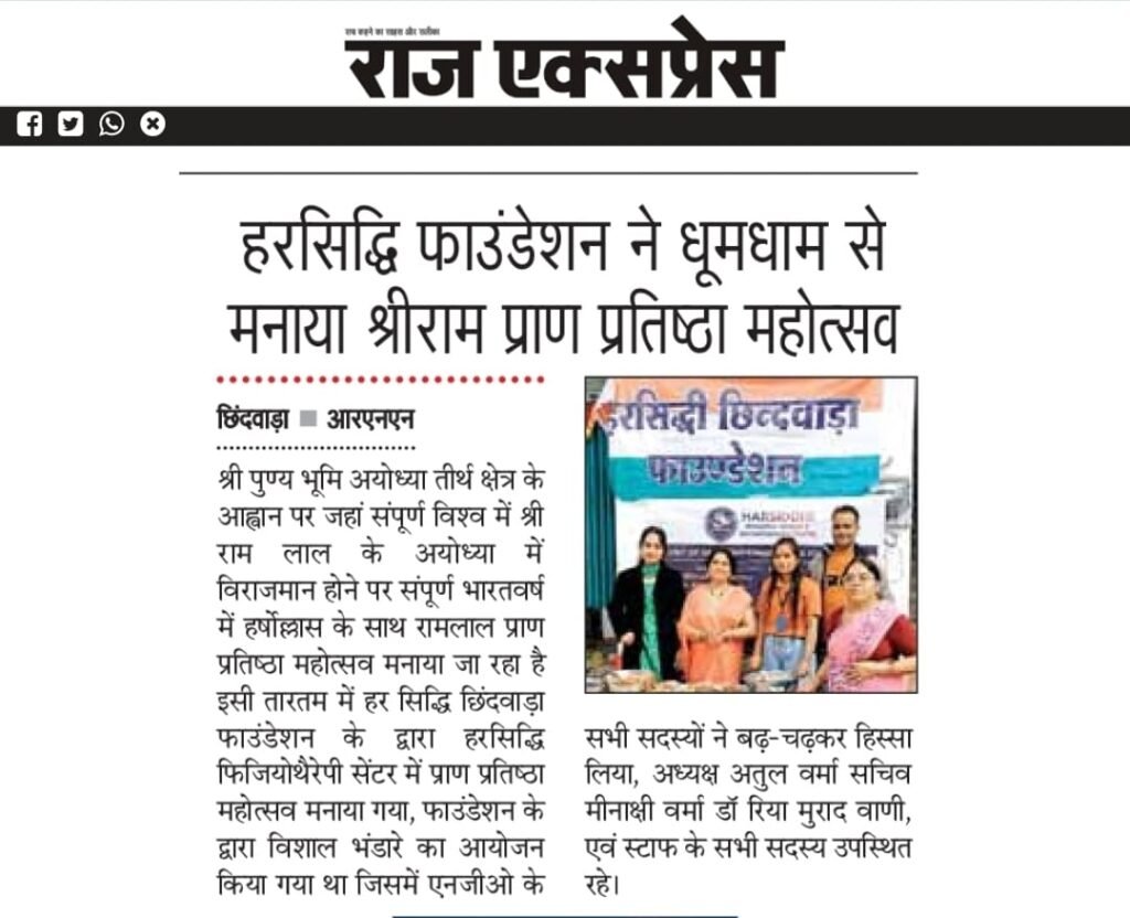 आज दिनांक 22/01/2024 को हरसिद्धि छिंदवाड़ा फाउंडेशन के ओर से रामलाल प्राण प्रतिष्ठा के शुभ अवसर पर हरसिद्धि छिंदवाड़ा फाउंडेशन के द्वारा दोपहर 12:00 बजे _ 7:00 बजे तक भंडारा का आयोजन किया गया |